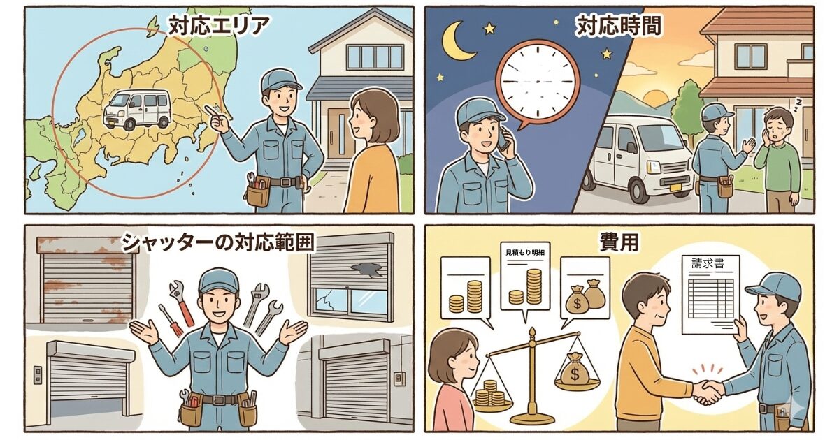 本ランキングは、単なる知名度や最安値ではなく、「シャッターが上がらず今すぐ困っている人にとって頼りやすいか」という視点で総合評価しています。