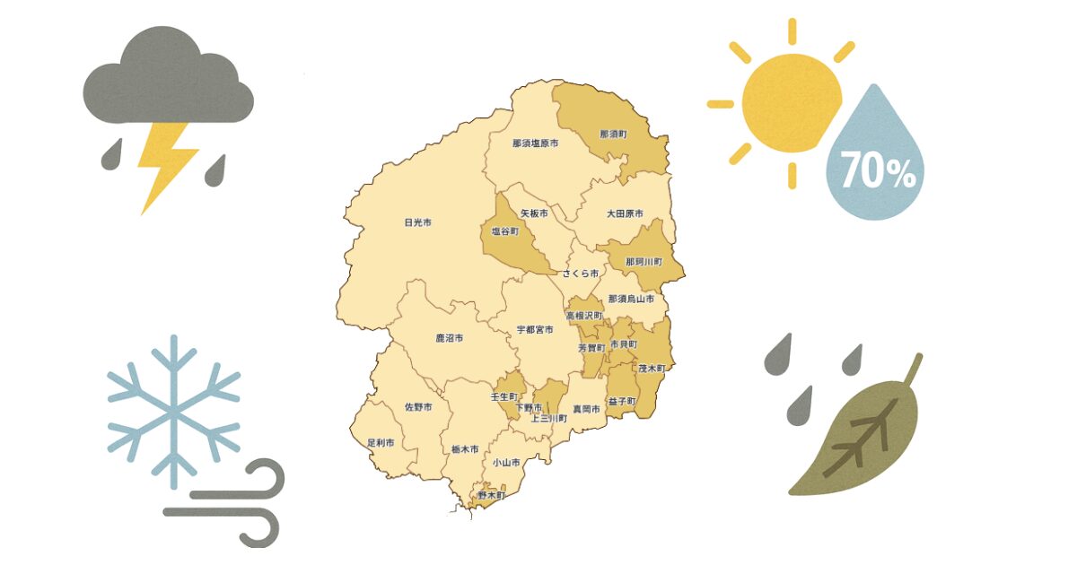 栃木県は内陸性で四季の寒暖差が大きく、夏は蒸し暑く雷雨や多雨の季節になりやすく、冬は「からっ風」による乾燥と厳しい冷え込みがあり、さらに平地と山間部で気候条件が大きく異なる地域です。